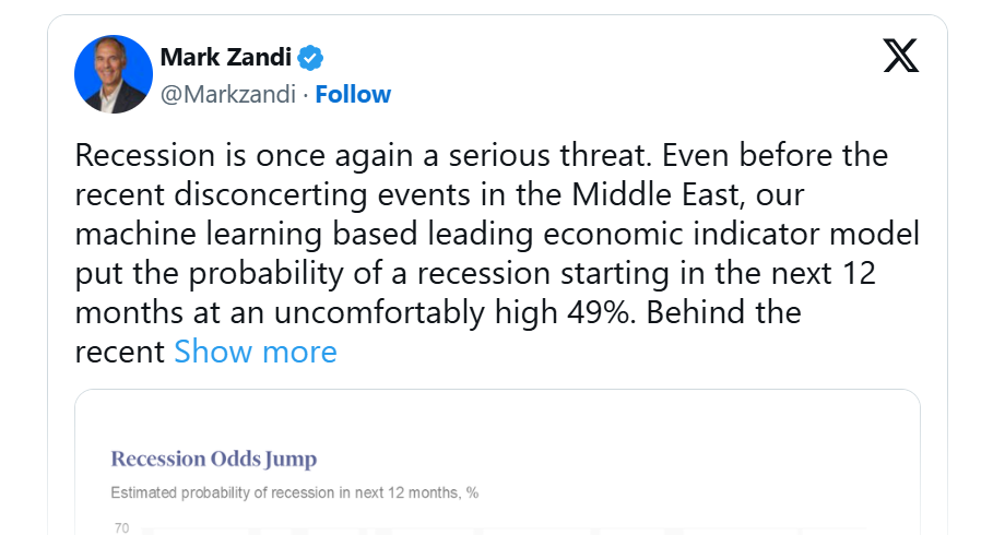 隨著穆迪的經濟衰退模型指數升至48.6%,創下歷史新高,表示未來12個月內可能出現衰退的可能性,這一數值在過去的數據序列中,尚未在沒有隨後經濟衰退的情況下達到過此水平。這也意味著美國經濟正邁向一個“生死點”,即將迎來實質的經濟挑戰。此時,美國經濟的增長放緩、勞動市場疲軟、油價高於每桶100美元,加上比特幣在近期的上漲,形成一個複雜且具有預警意味的市場背景。